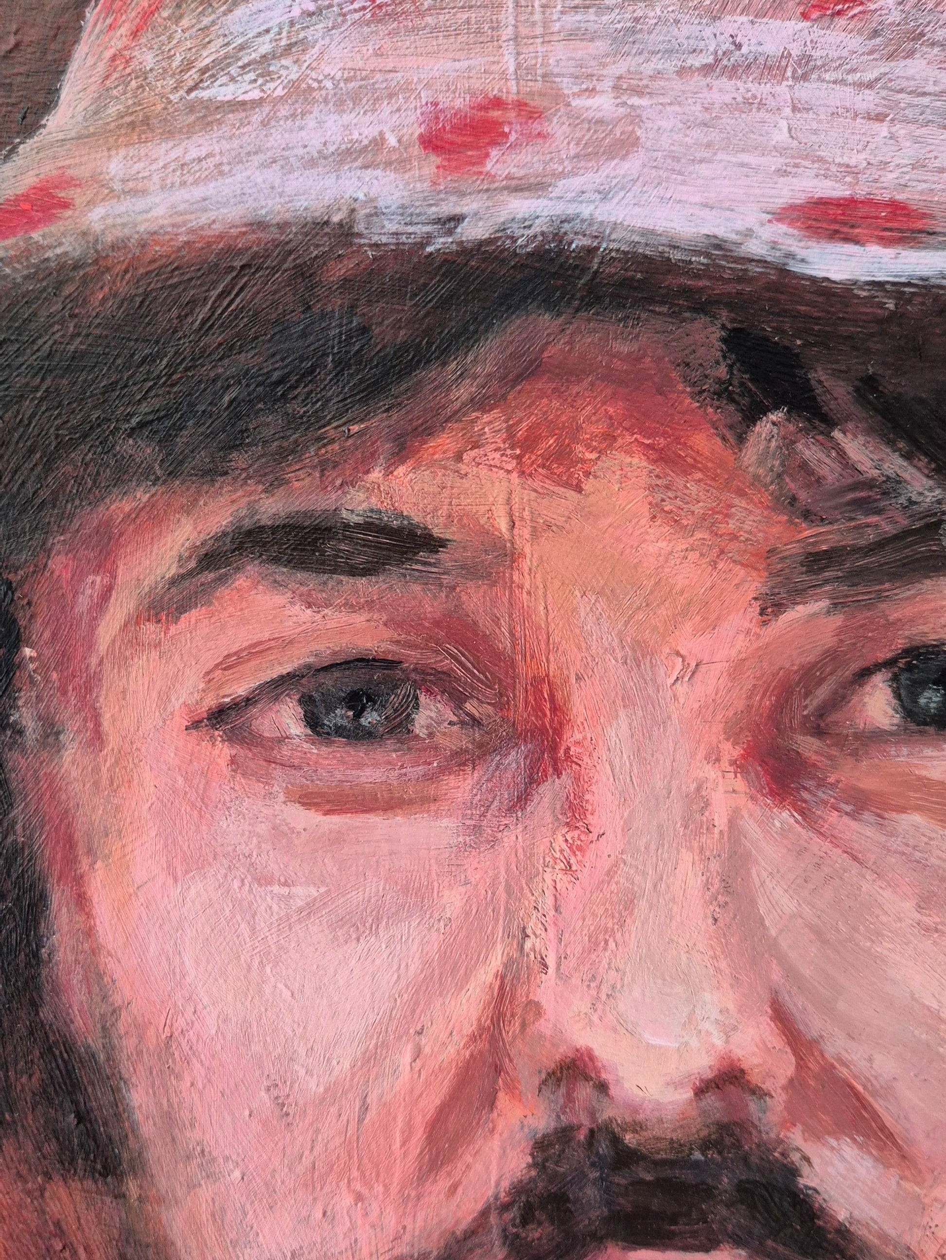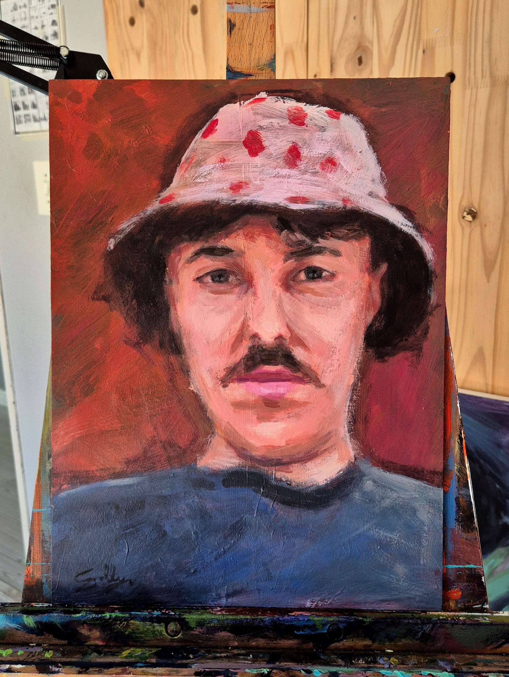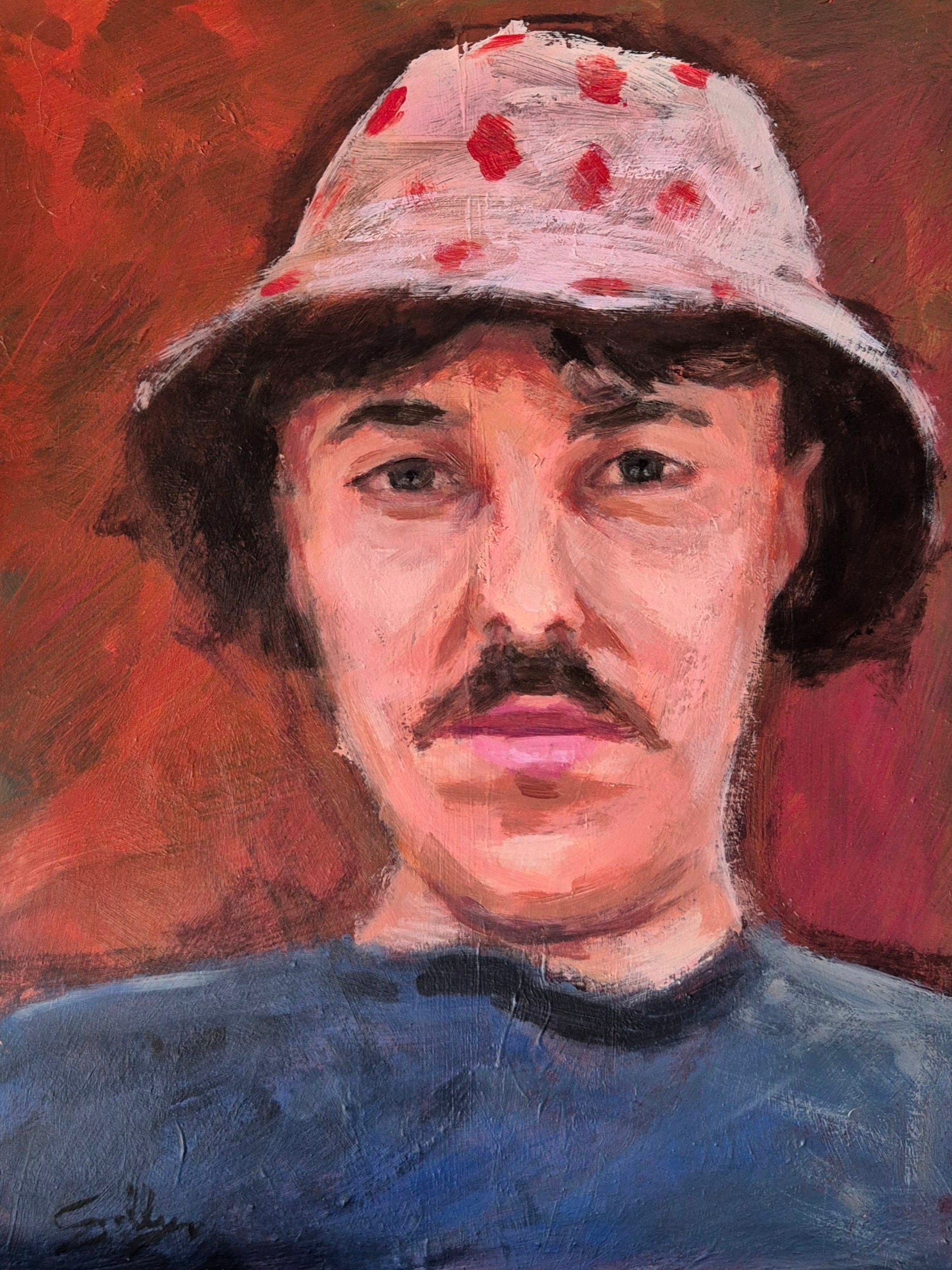 About the work:A portrait about the contradiction of depression - the strange state where life is objectively good and you want to feel happy, yet your body refuses to follow. The playful hat and warm colors hint at lightness, but the expression underneath carries fatigue and uncertainty, capturing that quiet tension between performing happiness and privately struggling to feel it.